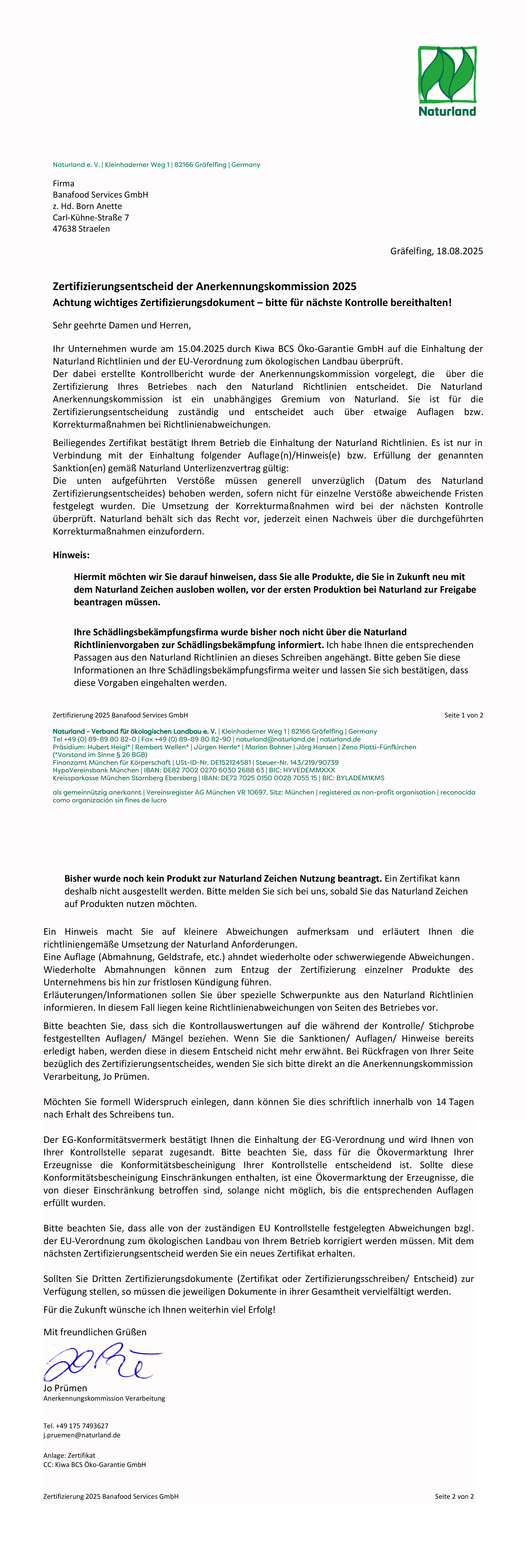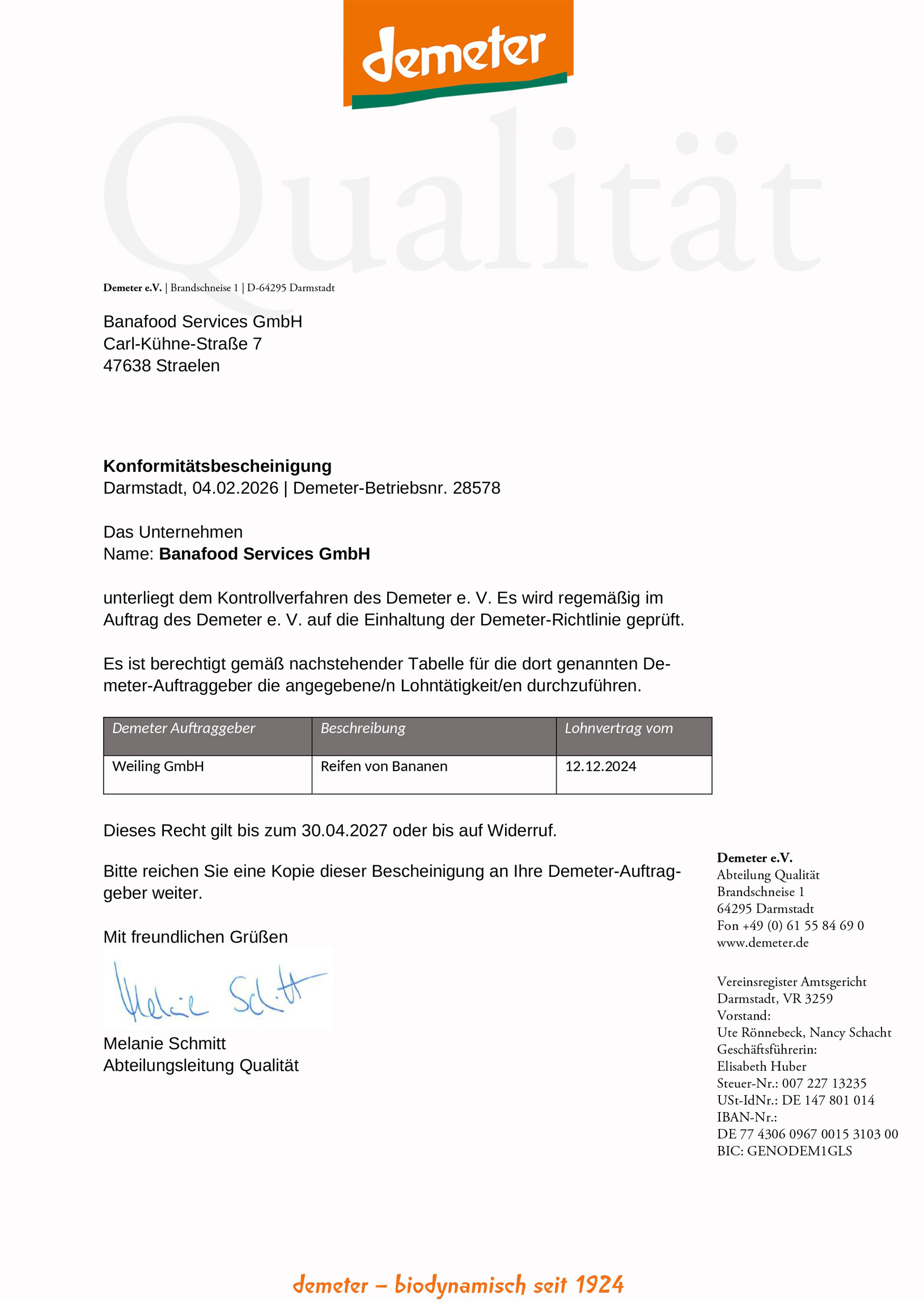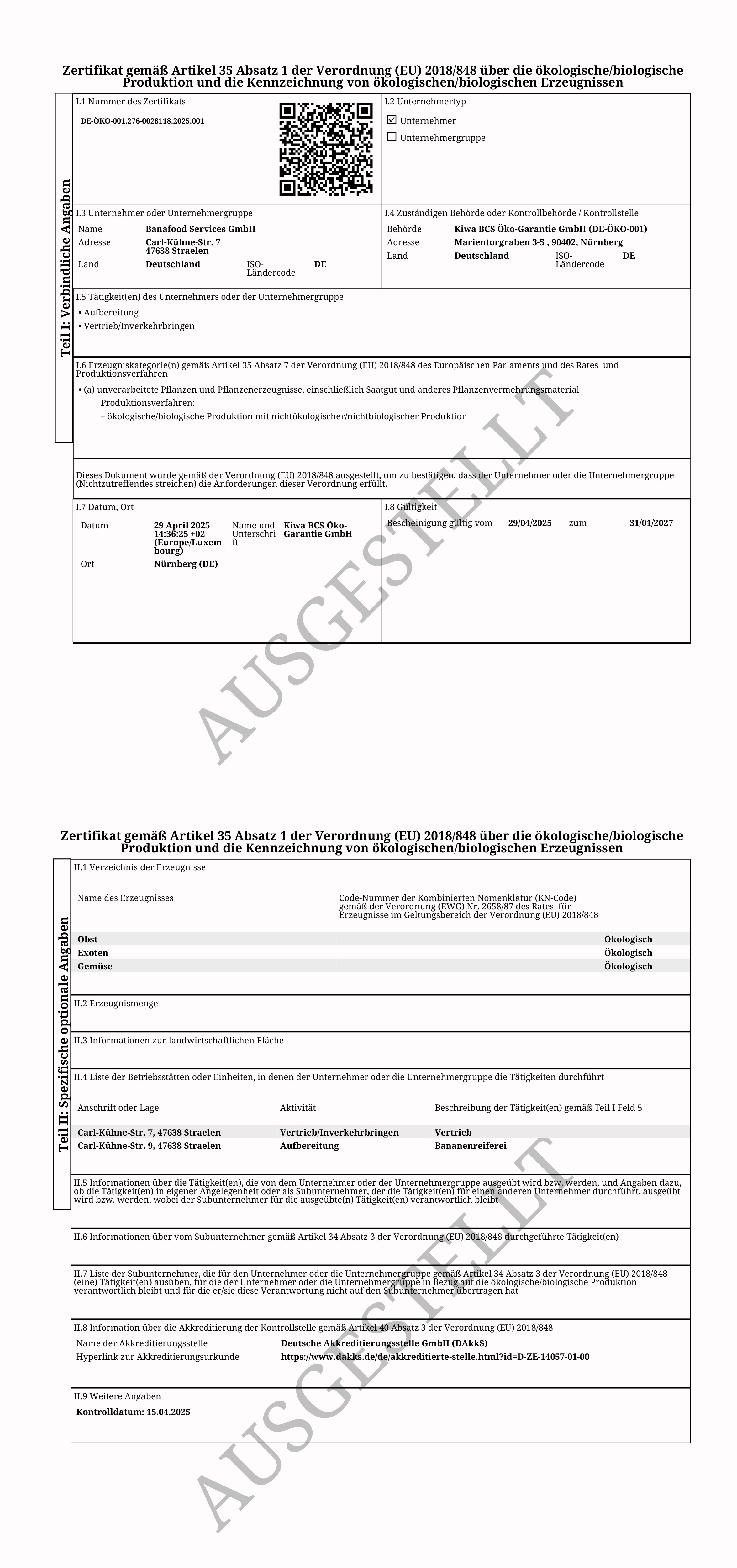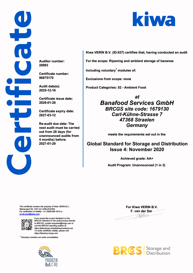 Banafood Services GmbH is zowel BRC als BCS-bio gecertificeerd.